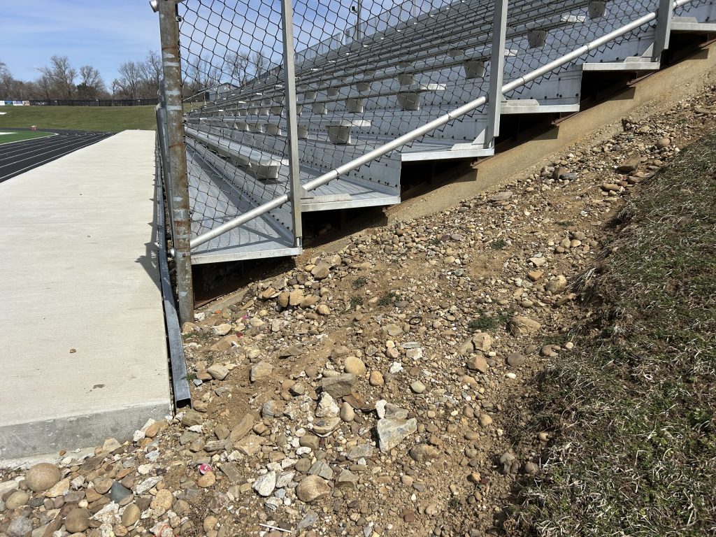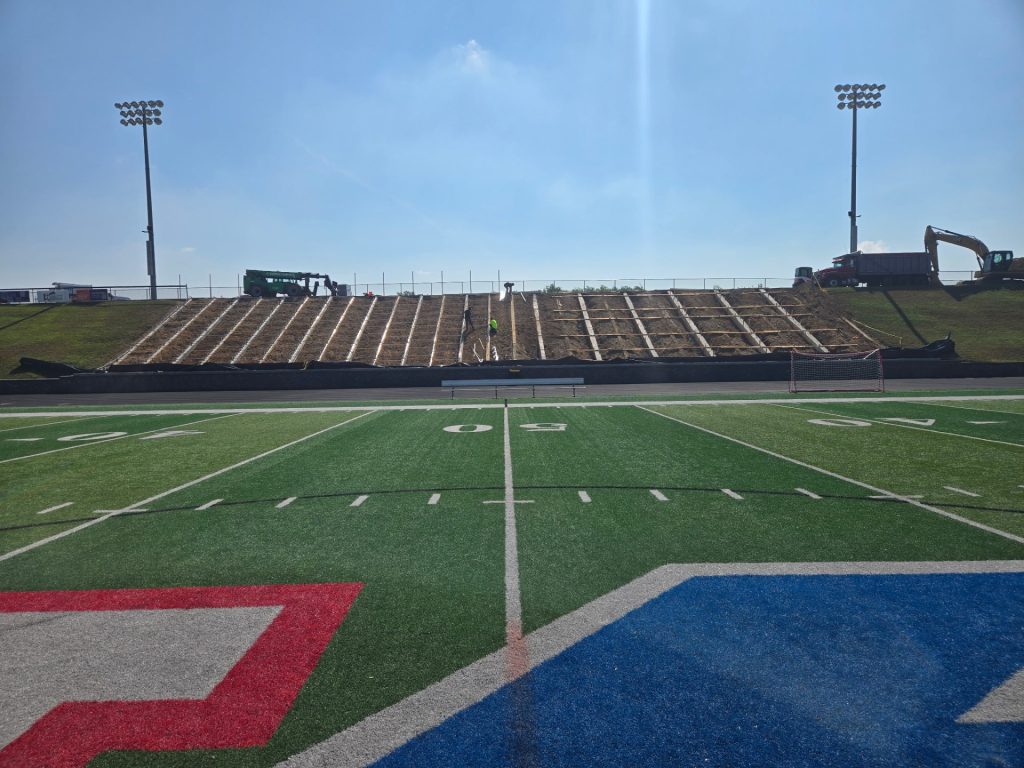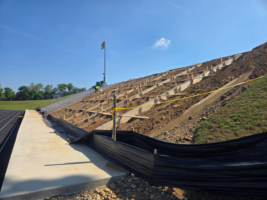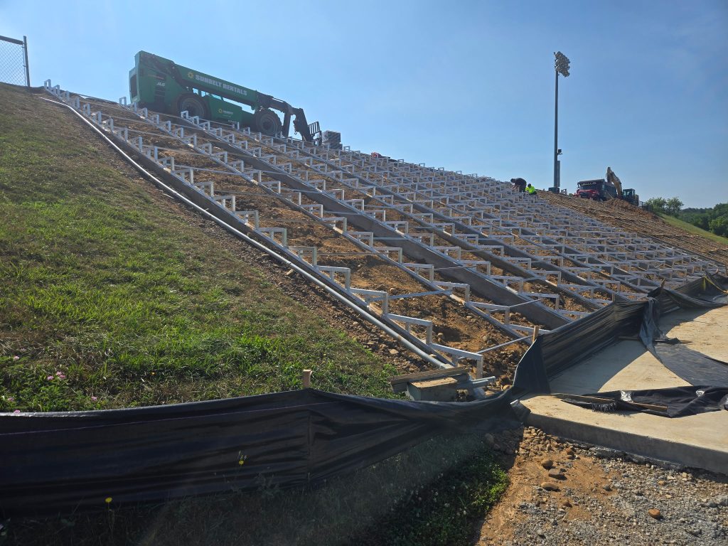 The parameters of the project mirrored the 2019 home grandstands project – installing new aluminum angle frame structures to replace the visitors’ side structure. This included the removal and re-use of the existing planks, risers, and seats on the bleacher. Additionally, it would require reinstallation of existing decking, riser, seat planks, and guard rails after the new aluminum structure had been installed. Additional items for ADA compliance were also a part of the project scope, which finished in the summer of 2025. The work needed to take into account the steep slope of where the bleachers were situated required additional grading and ensuring the new planks and understructure was secure prior to installing the upgrades.
