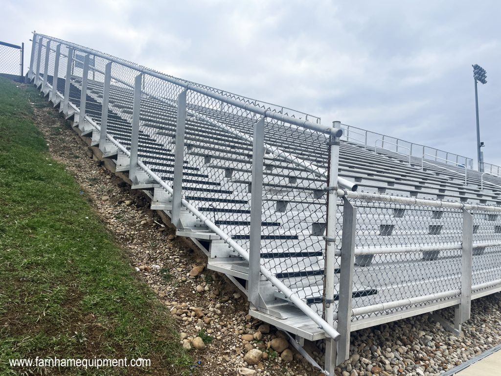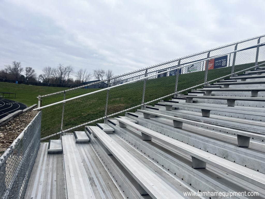 - Remove and re-use the existing aluminum walk planks, risers, and seats on the bleachers